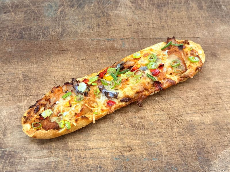 Pistolet gevuld met kipdöner, döner kruiden, knoflooksaus, rode ui, paprika en kaas