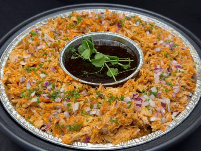 - Pulled Chicken in saus afgegarneerd met rode ui, bieslook en paprika
